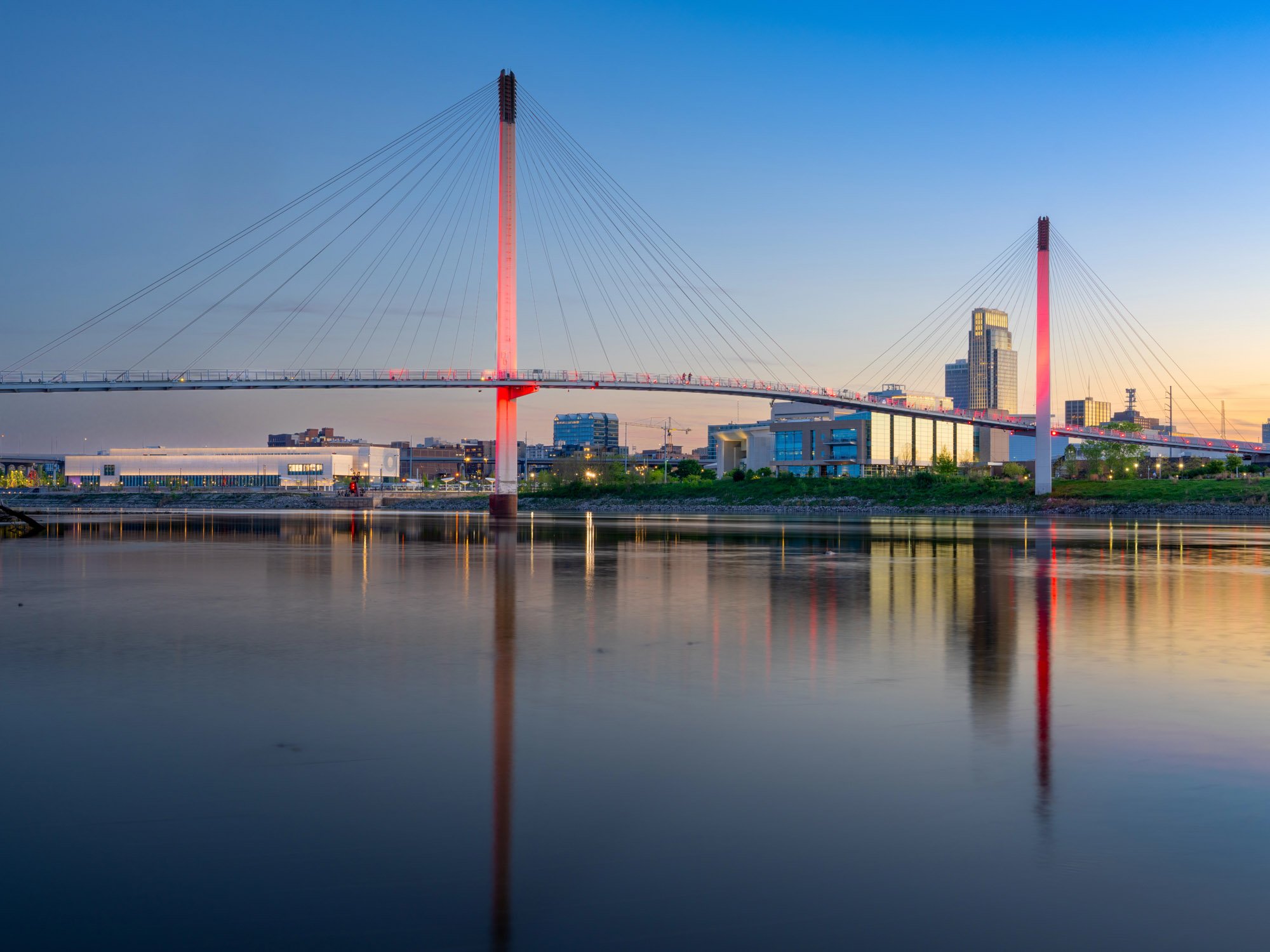 The Bob Kerrey Pedestrian Bridge crosses the Missouri River and connects Omaha with Council Bluffs, Iowa.